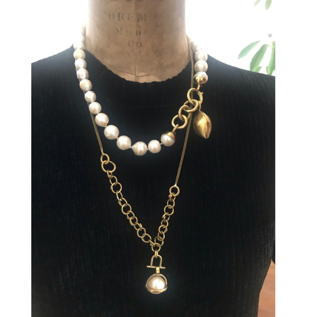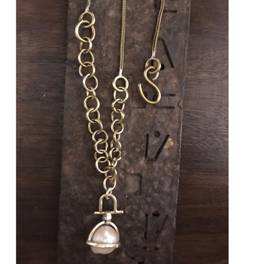 שרשרת חוליות פליז בעבודת יד בשילוב תליון פנינה